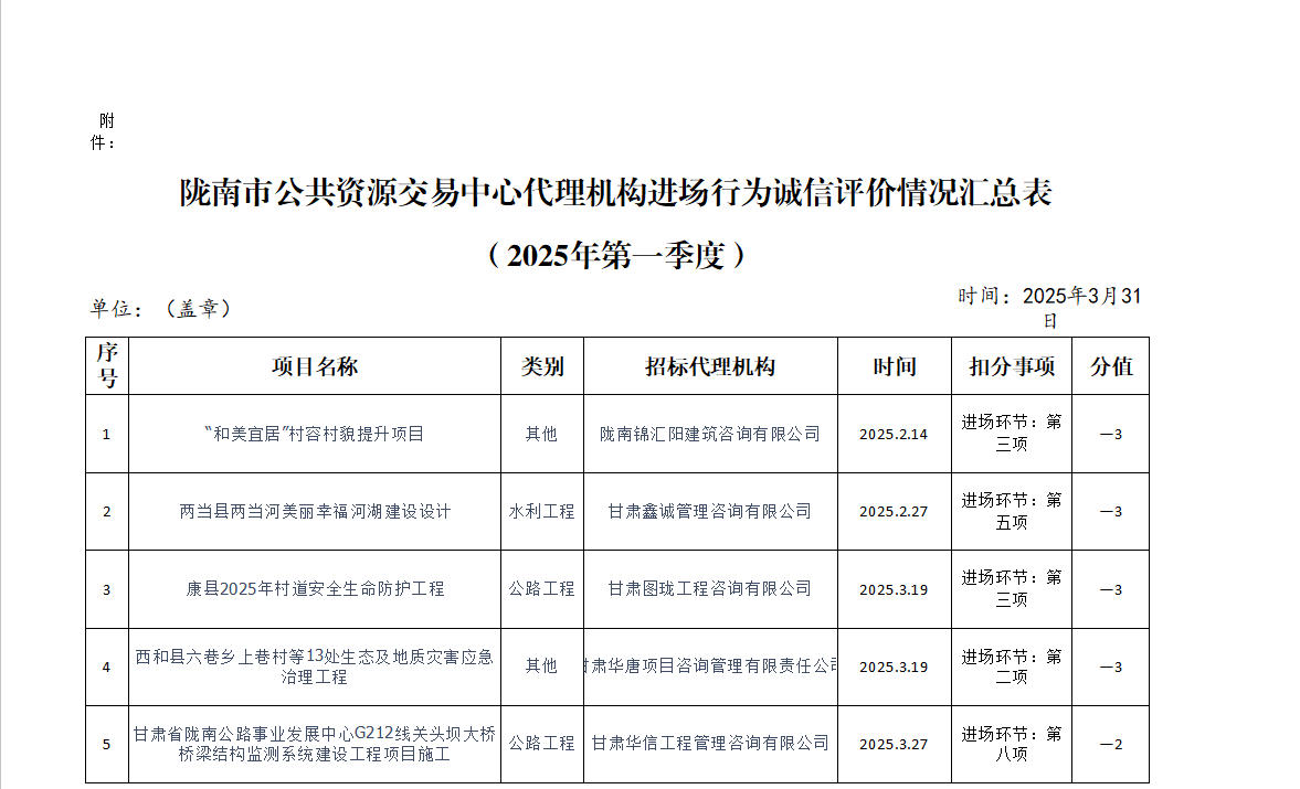 陇南市公共资源交易中心关于2025年第一季度代理机构进场行为诚信评价结果的公示