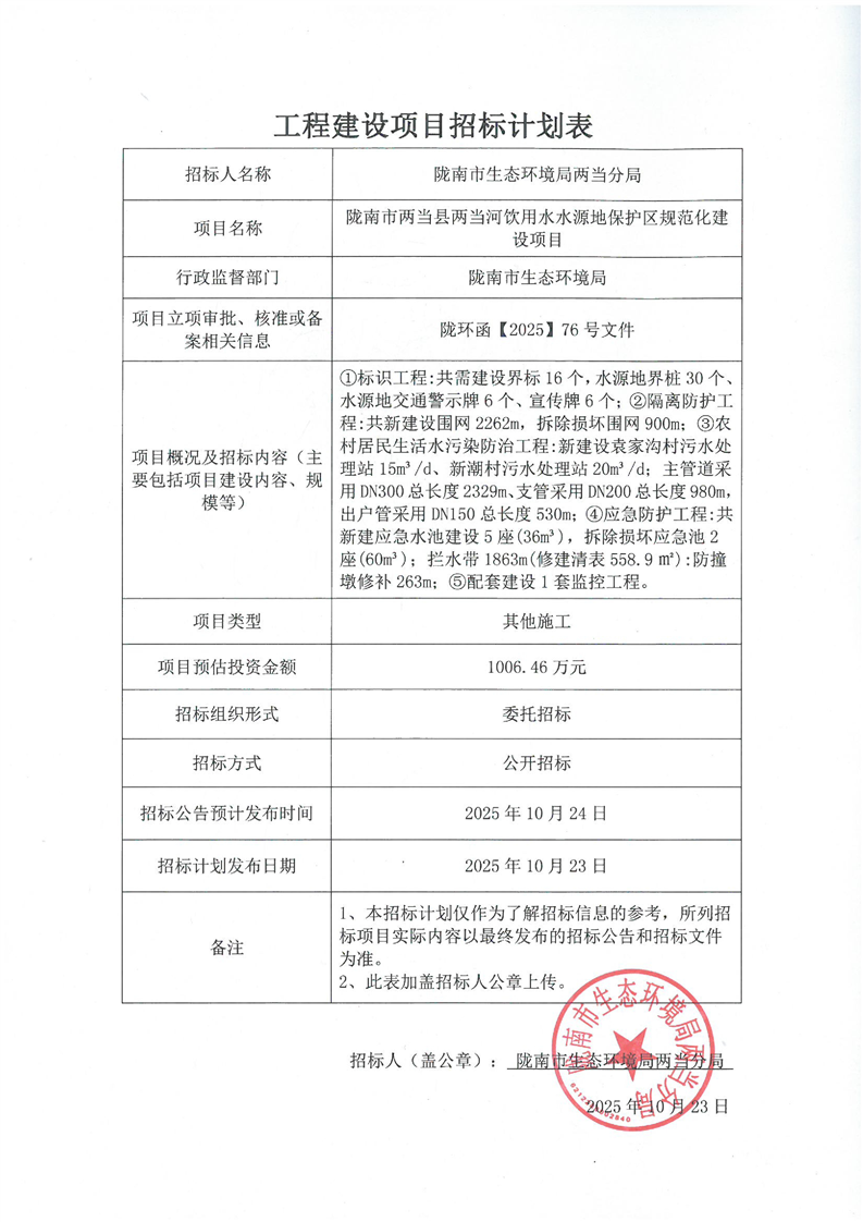 陇南市两当县两当河饮用水水源地保护区规范化建设项目