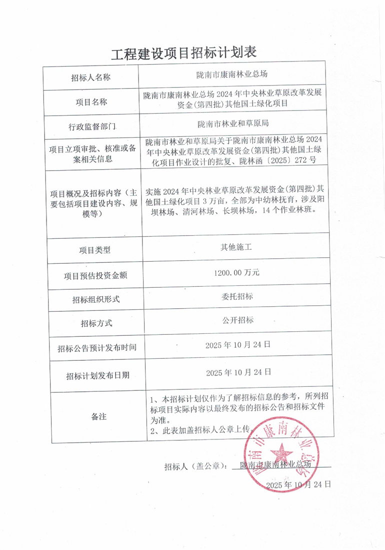 陇南市康南林业总场2024年中央林业草原改革发展资金(第四批)其他国土绿化项目